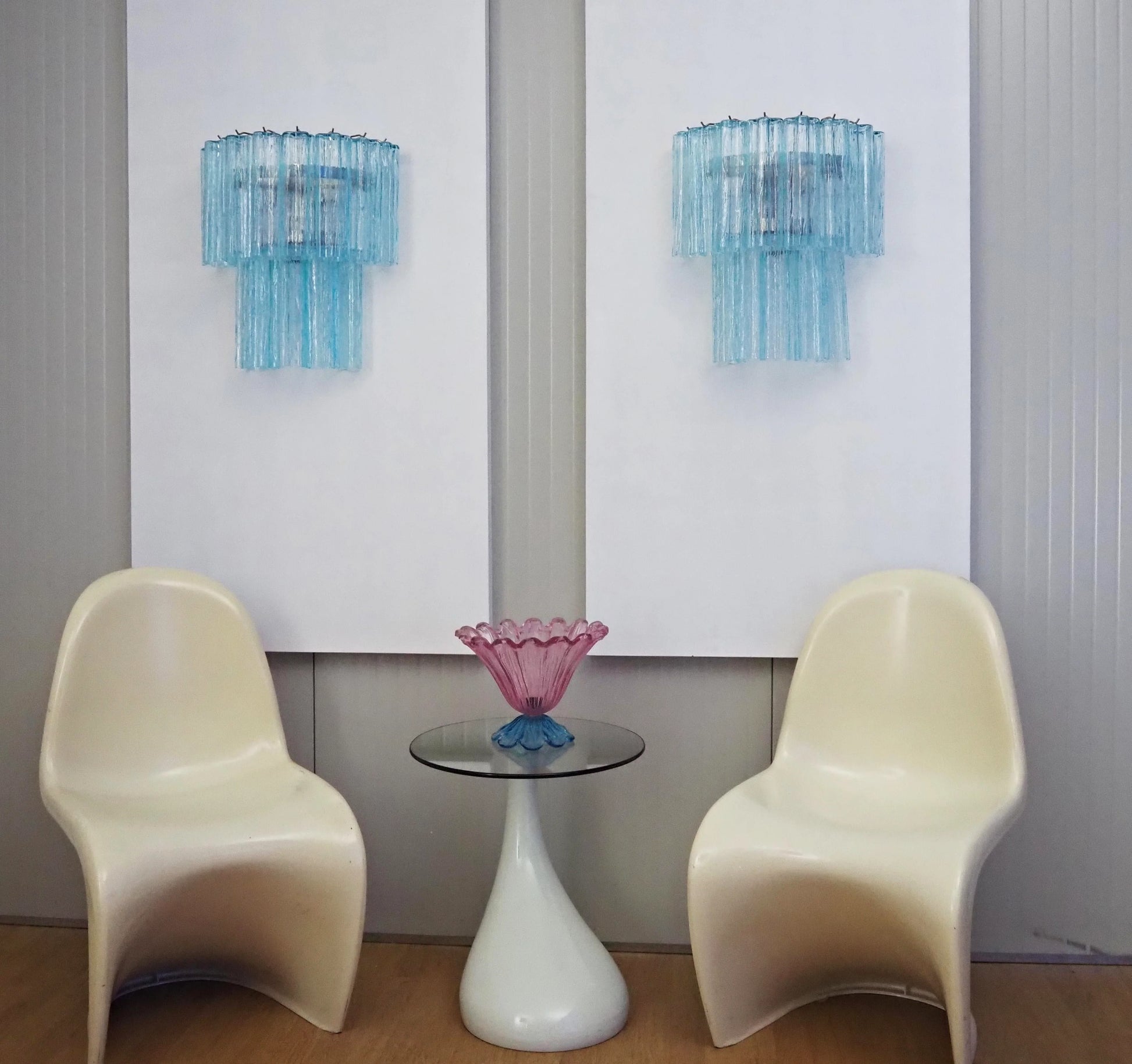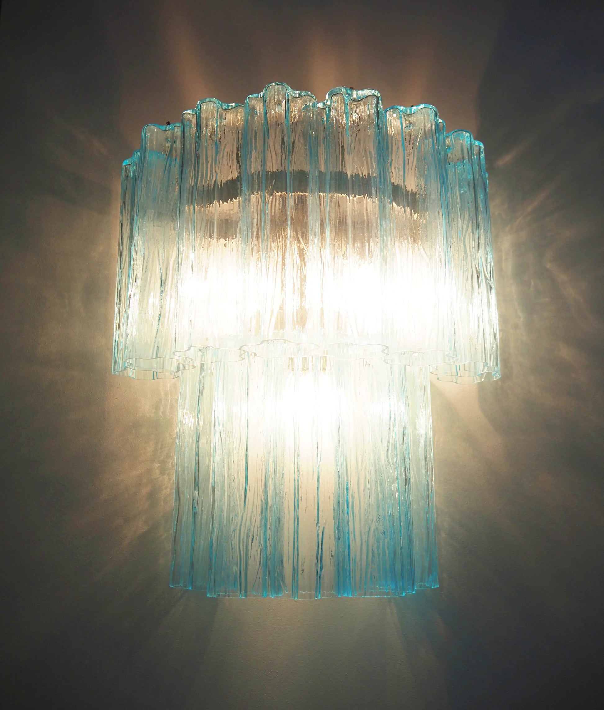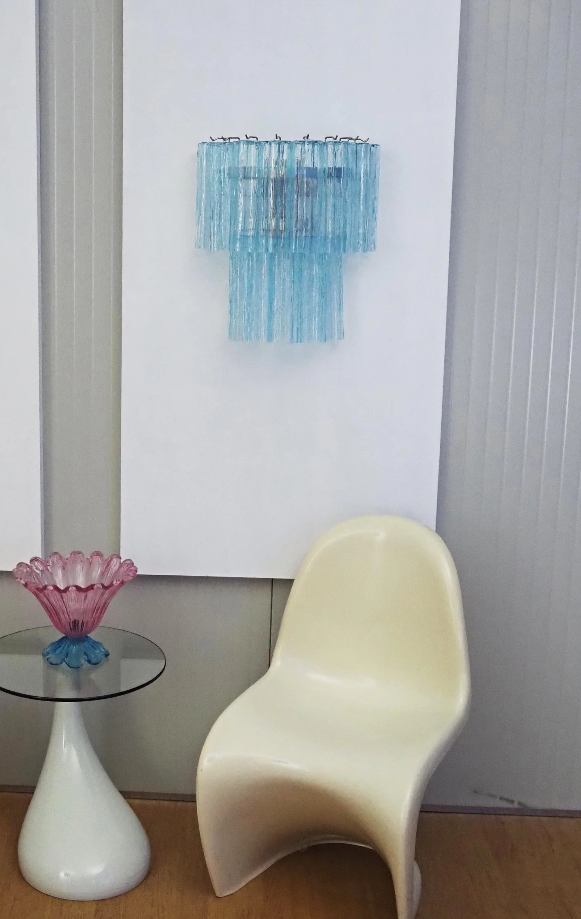 Elevate your home decor with our exquisite Blue Murano Glass Tube Wall Sconces. These vintage wall lamps are handcrafted in a stunning combination of Murano glass. With blue glass tubes forming a star shape, these sconces will add a touch of elegance and sophistication to any room.