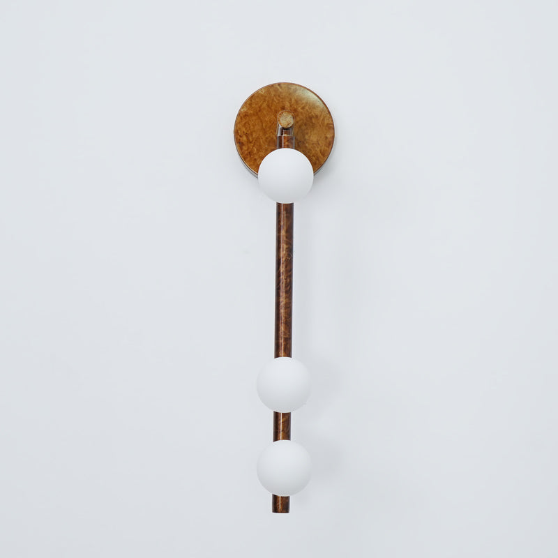 Brass Tube Wall Lamp System is comprised of small blown glass droplets illuminated with warm LEDs. Custom brass tube hardware is available in a variety of new finishes, including verdigris finish created by hand using a mixture of salt and ammonia. The vibrant patina recalls lichen, algae, and other natural phenomena that take over surfaces with a mind of their own. The Mottled Brass and Tarnished Nickel finishes are both oxidized and hand-rubbed, lending depth to the sleek hardware.