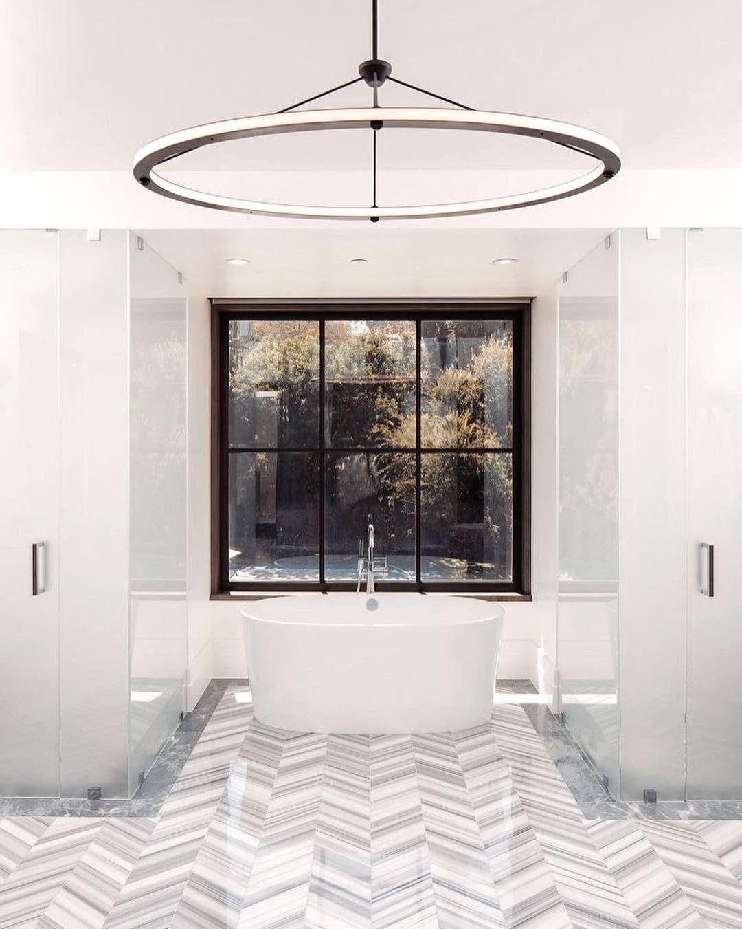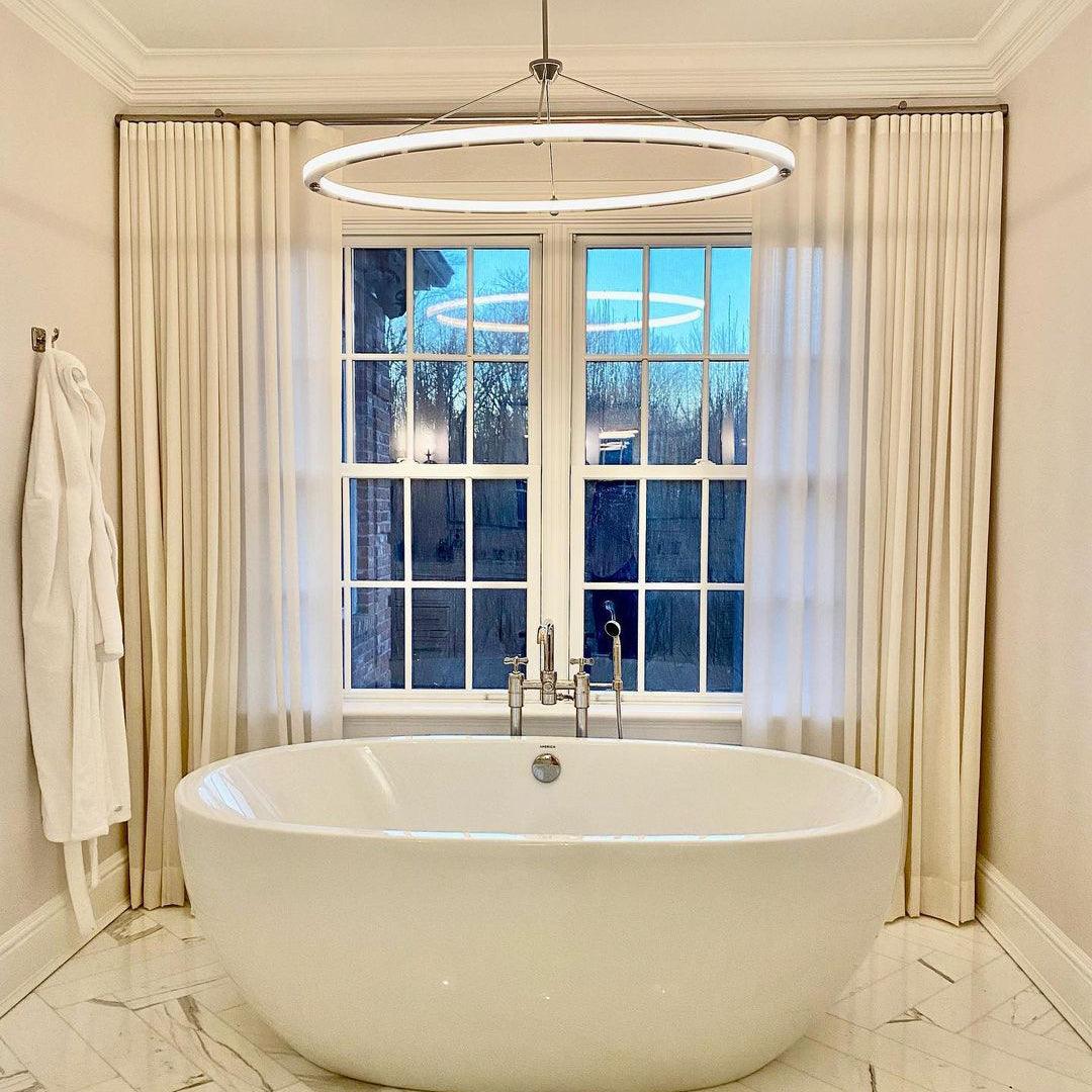 Halo Pendant lamp as a graceful exercise in the use of energy-efficient LED technology. The collection, is distinguished by its use of cascading rings and bars of light.