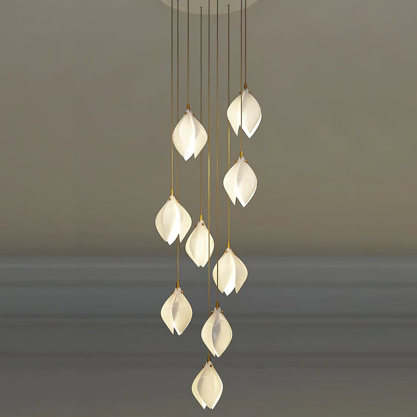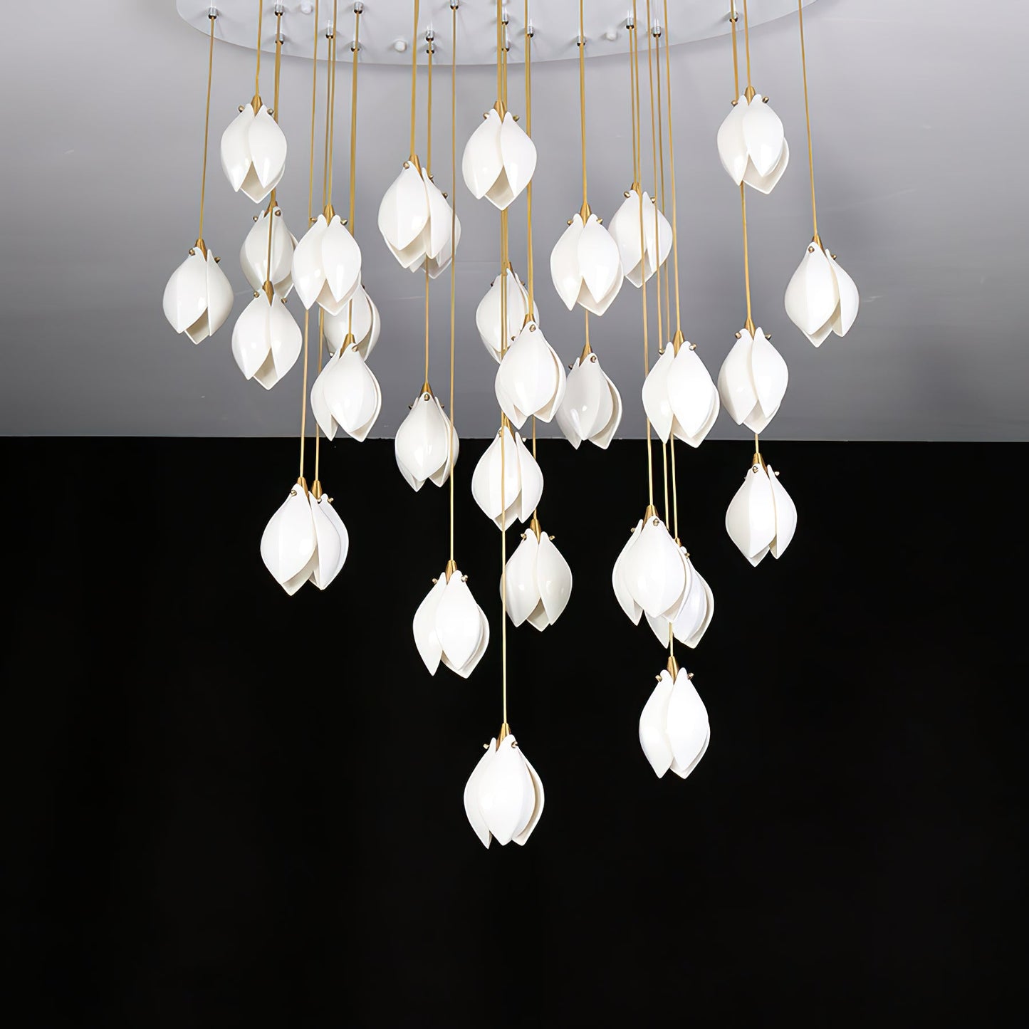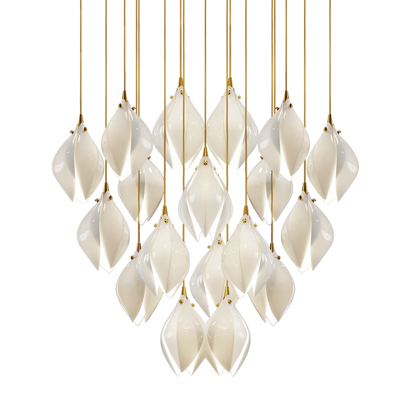 BLOOM is a lighting range inspired by the first blooms of Spring. The stylised Bloom buds are lit from within creating a soft glow through the soft matt or gloss white porcelain petals. Buds are accented in gold with plated fixings and fine silk braided cable to bring a timeless opulence to the installations.