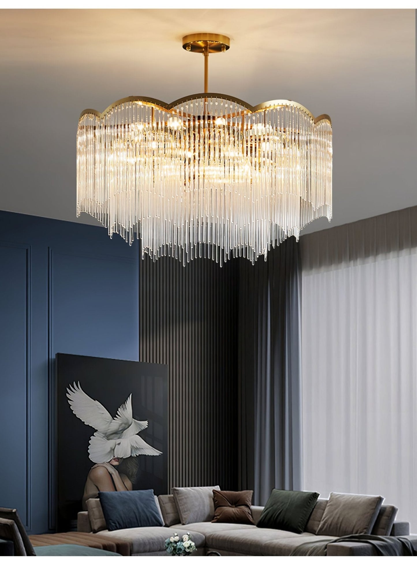 The pendant lamp uses a transparent glass rod pendant and an all-copper lamp stand to outline a minimalist wavy shape, which looks dreamy and romantic.
