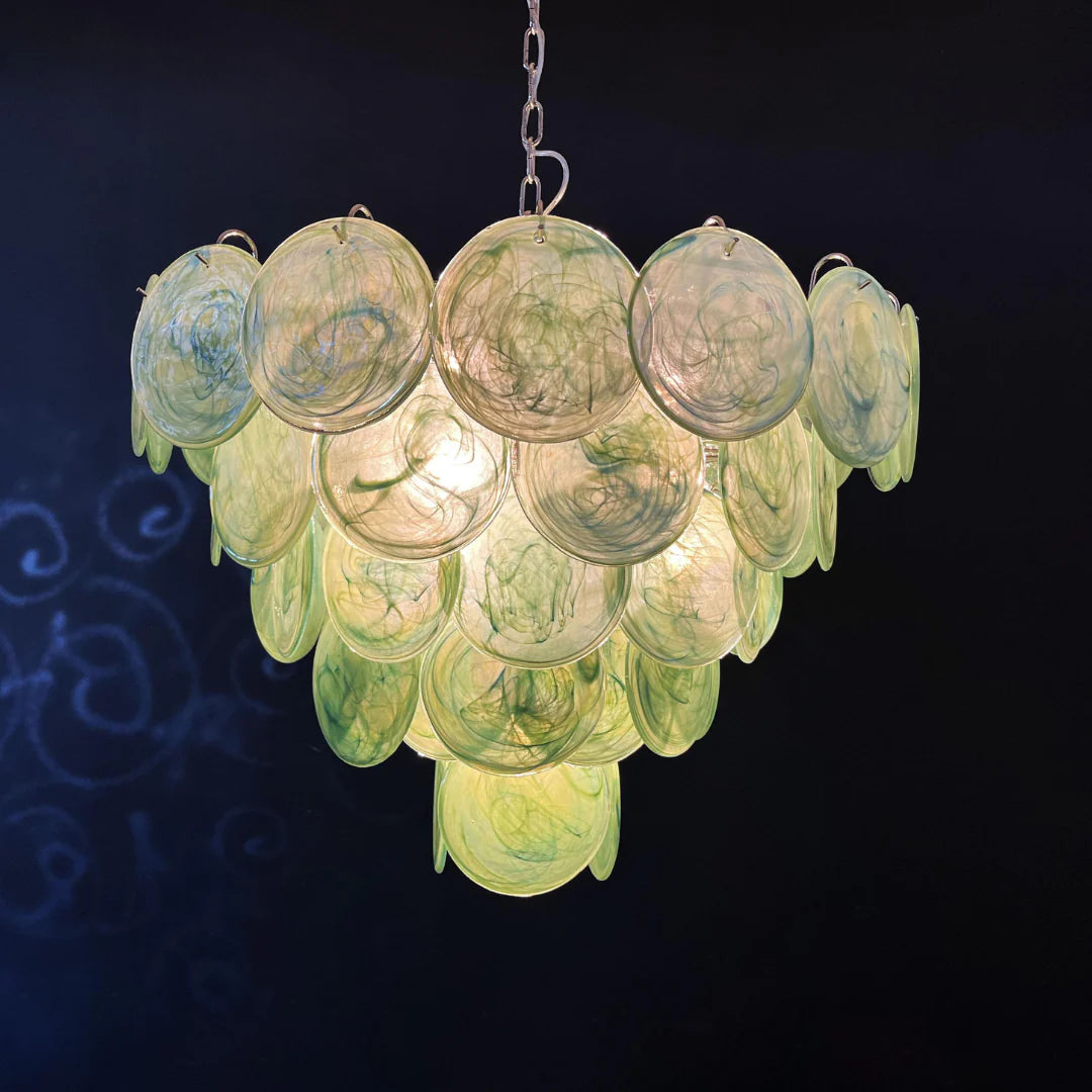 Elegant Green Murano Iridescent Disc Chandelier, Elevate your home decor with the breathtaking Chandelier featuring exquisite Green glass disks. Combines contemporary design with classic craftsmanship, creating a mesmerizing focal point in any room. Provides a warm and inviting glow that enhances the atmosphere and adds a touch of elegance to any space.