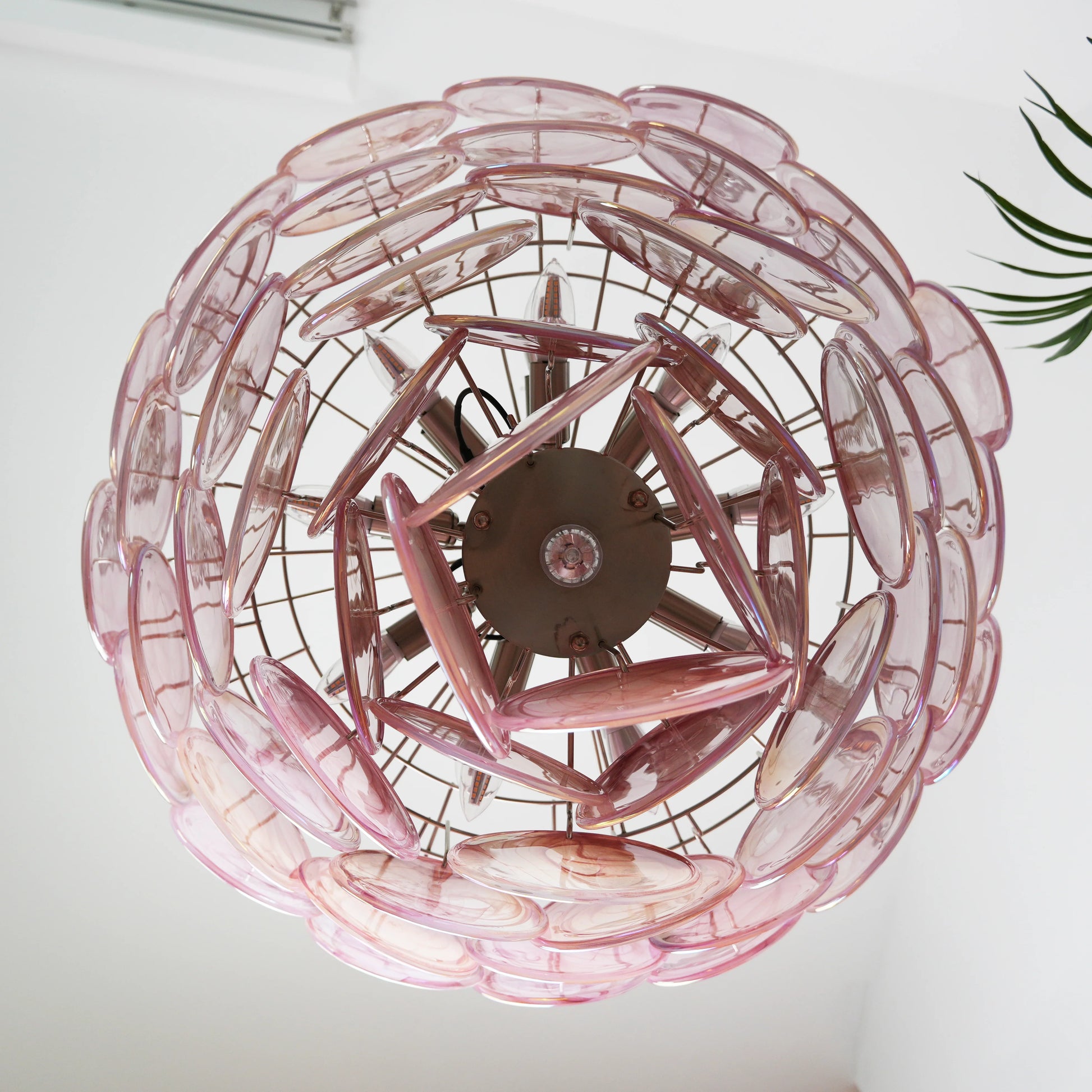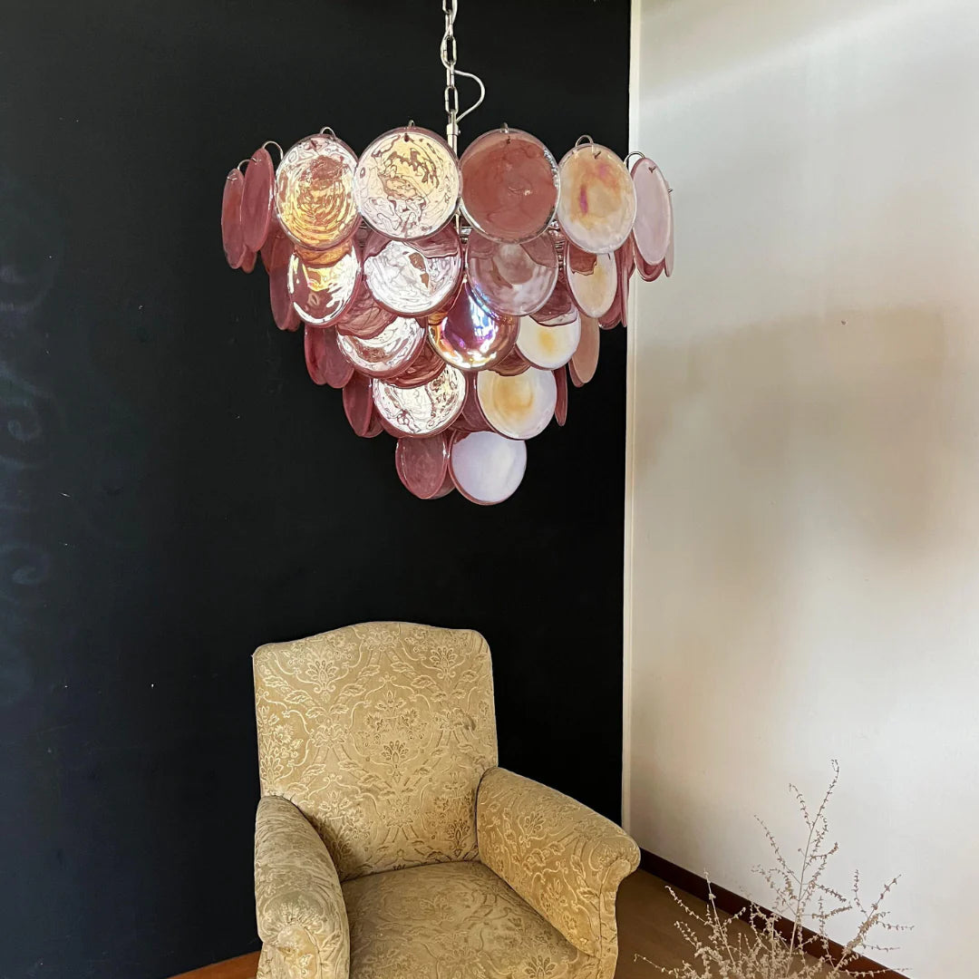 Elegant Pink Murano Iridescent Disc Chandelier, Elevate your home decor with the breathtaking Chandelier featuring exquisite Pink glass disks. Combines contemporary design with classic craftsmanship, creating a mesmerizing focal point in any room. Provides a warm and inviting glow that enhances the atmosphere and adds a touch of elegance to any space.