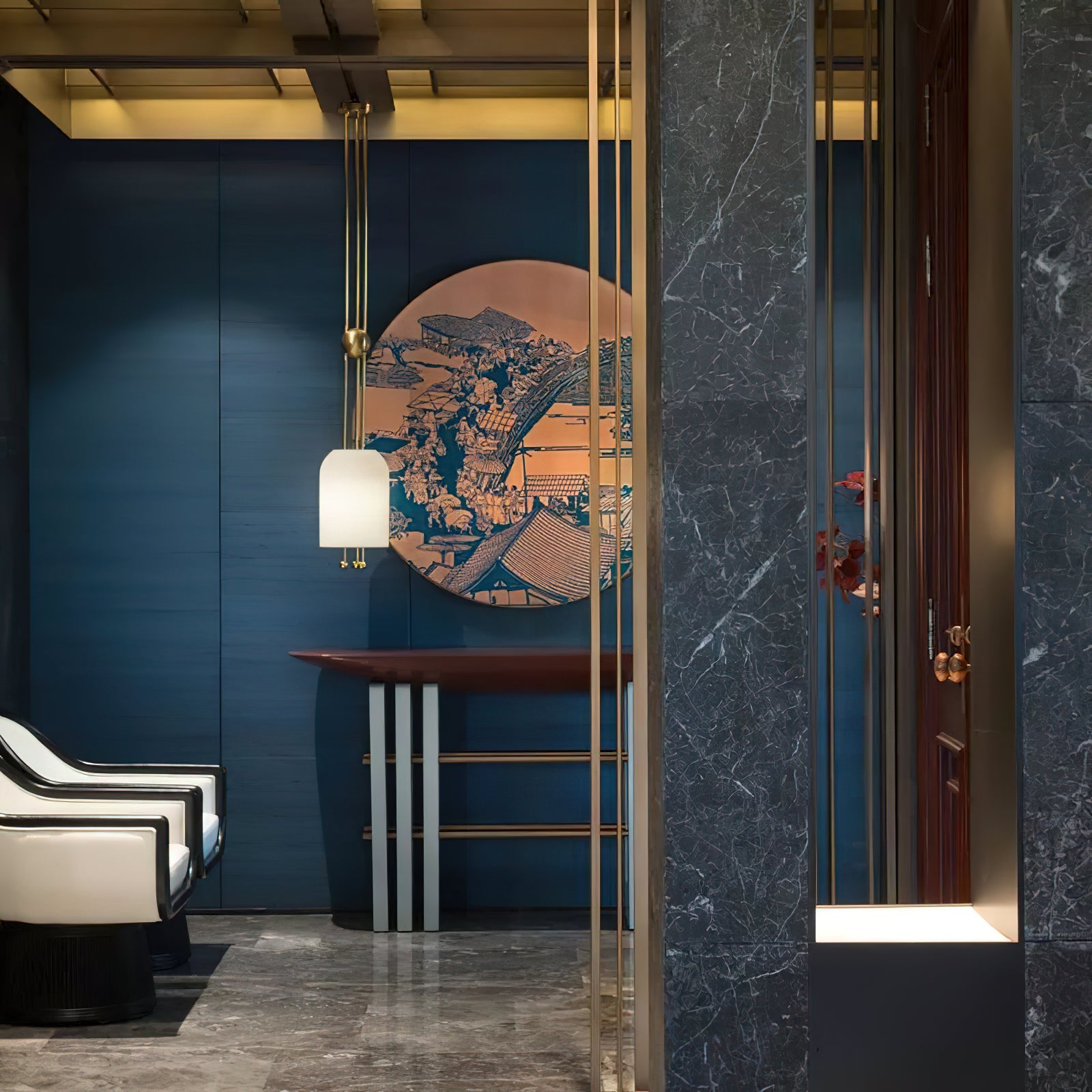 The Lantern Pendant by Radilum features slip-glass forms that float along a rigid metal structure. The finely incised fluting punctuates the light’s glow, connecting to the historical lanterns’ most essential element – light passing through a delicate protective form. The repeating spheres act as a counterpoint to the sizeable shades.