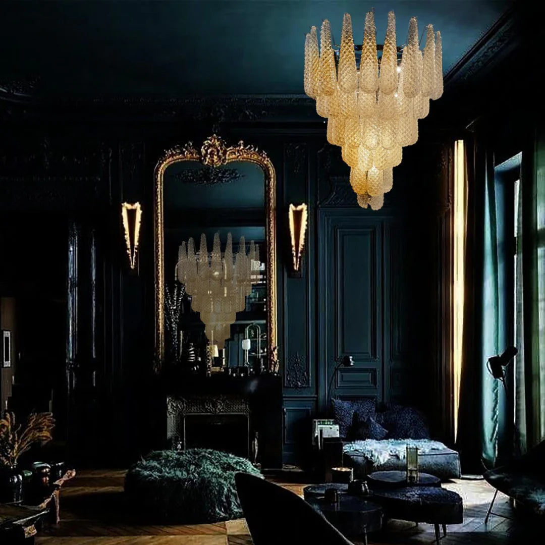 Vintage Amber Murano Glass Petals Drop Chandelier. This beautiful chandelier showcases handcrafted glass petals, each featuring a stunning amber. It's not just a lighting piece, but a stunning work of art that will captivate and brighten your space.