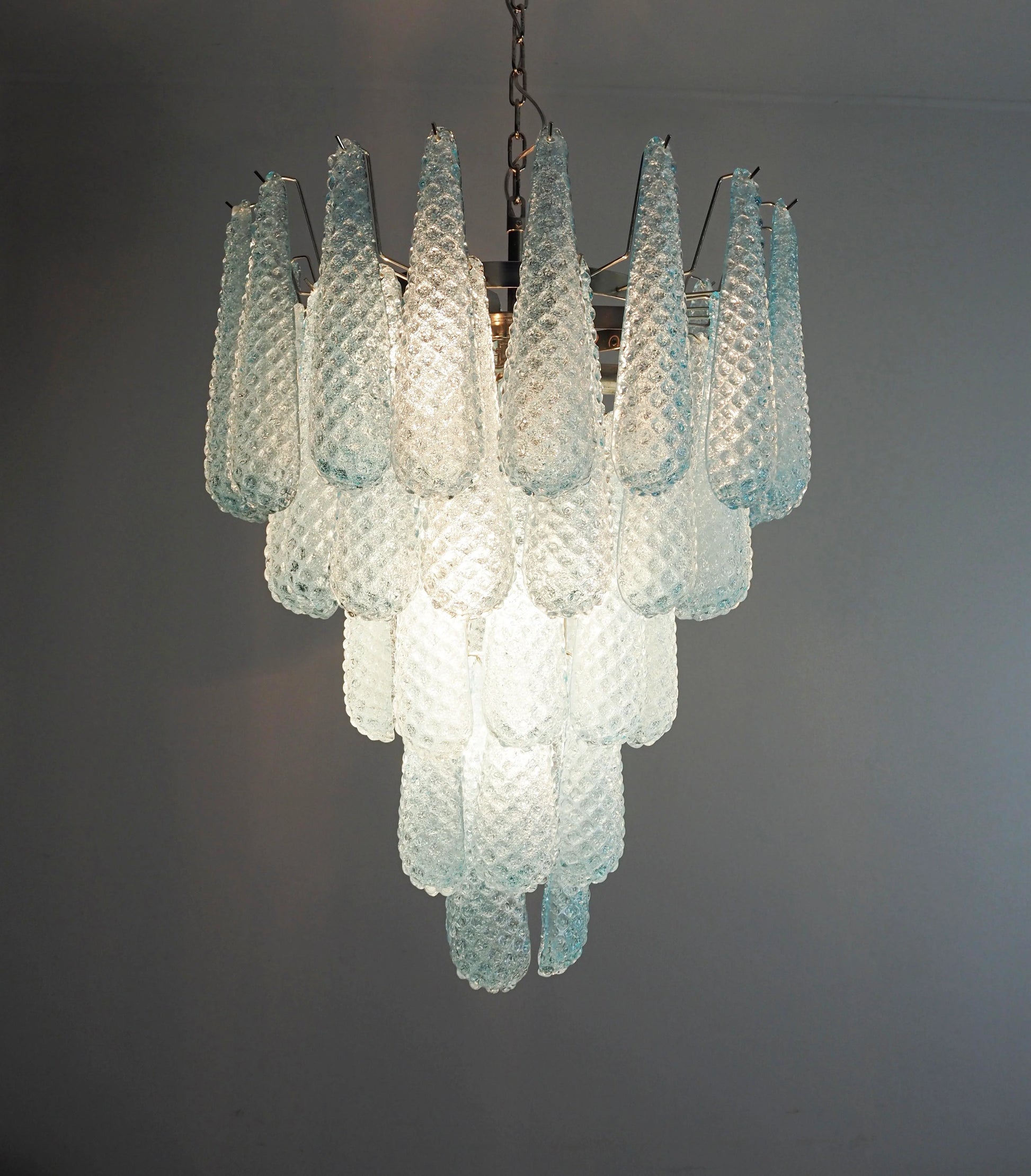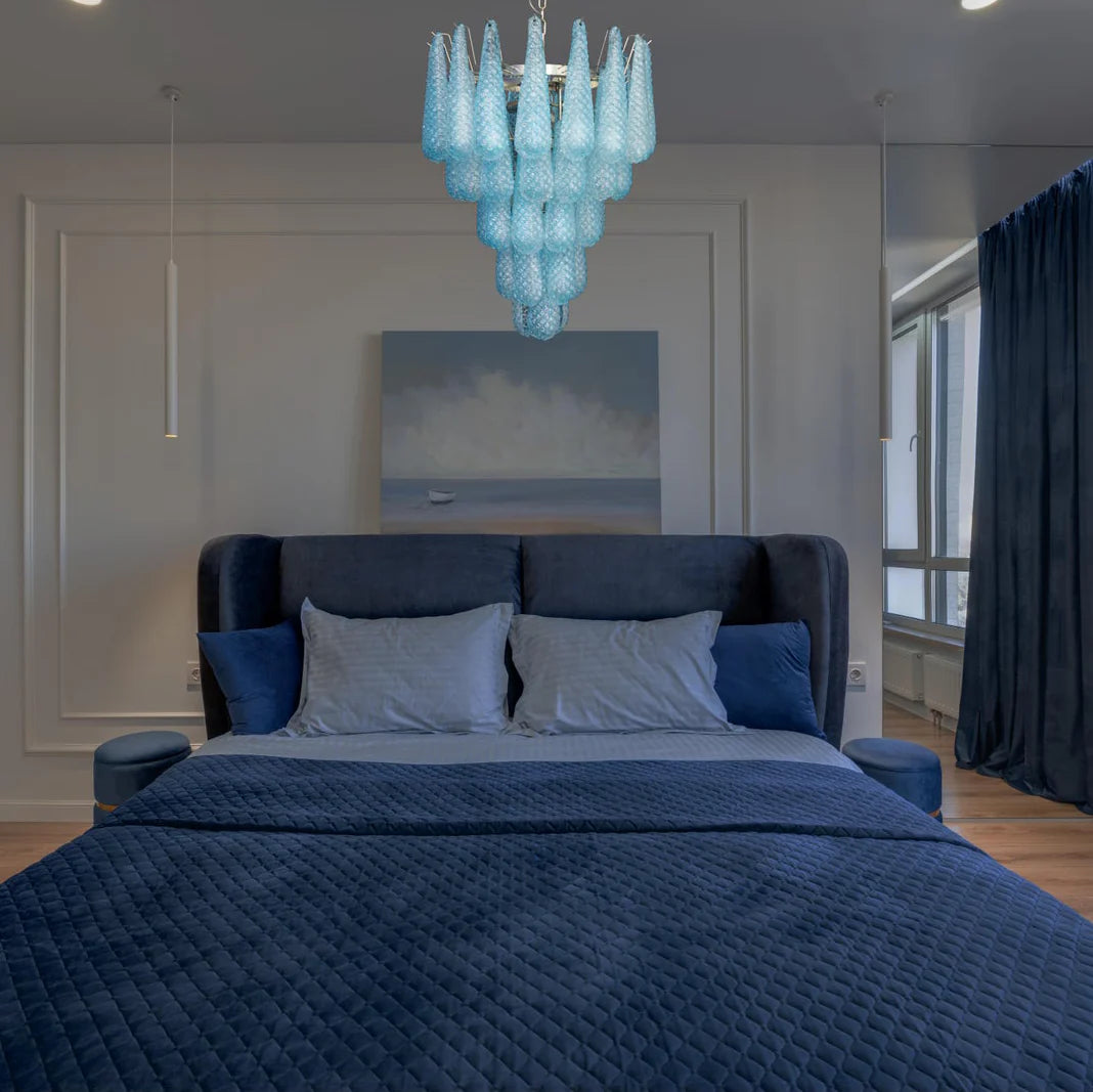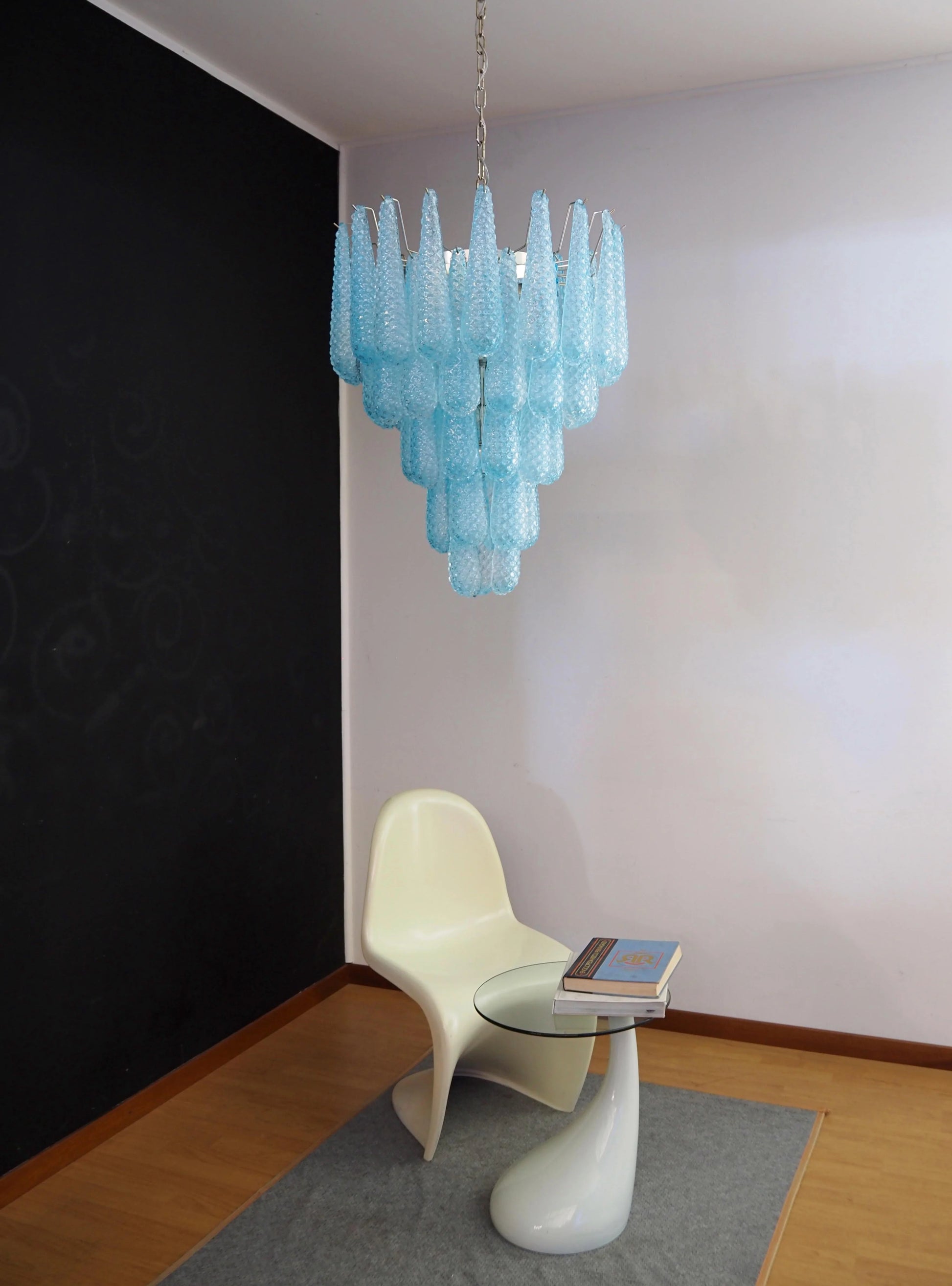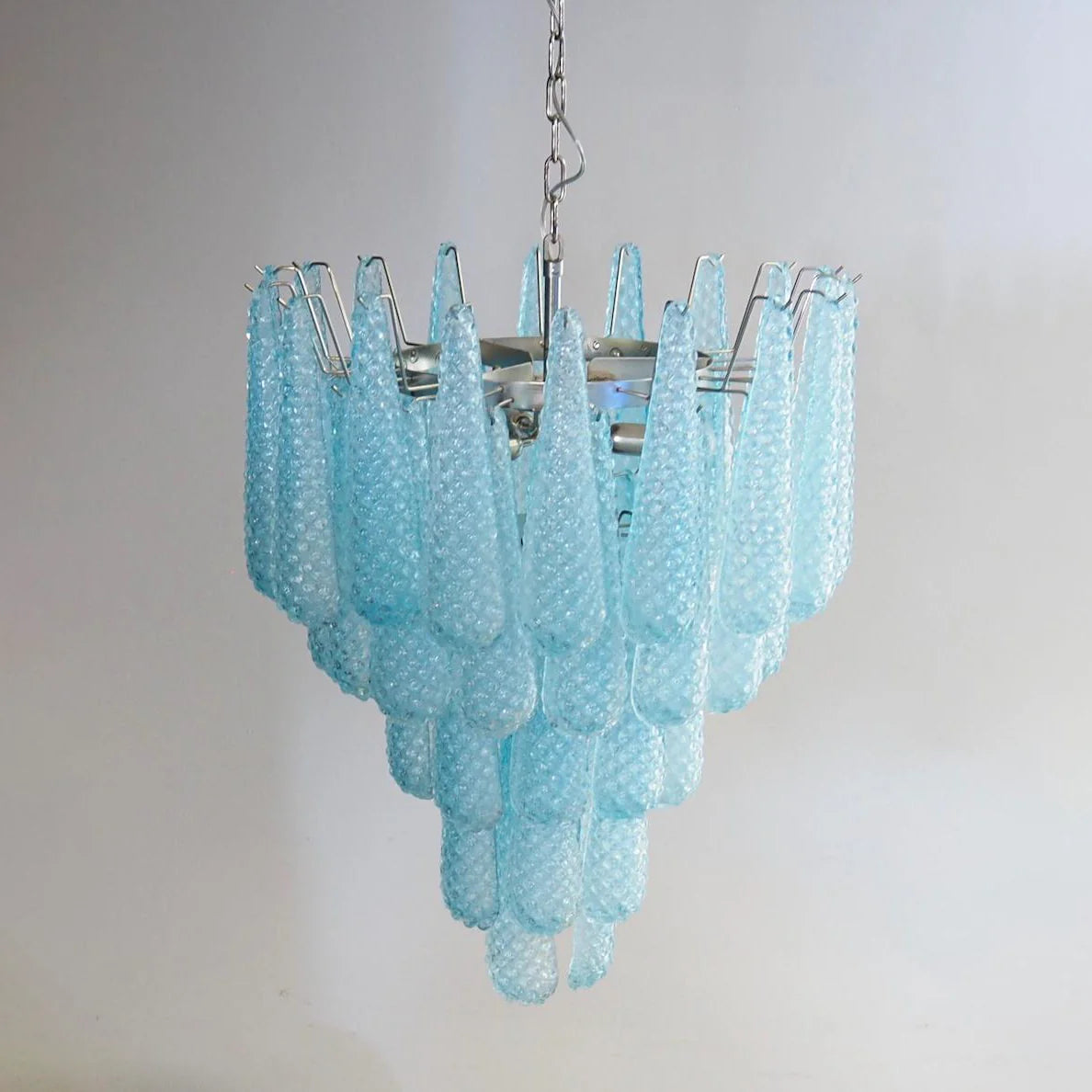 Vintage Murano Blue Petals Drop Glass Chandelier, Experience the perfect fusion of art and illumination with our stunning Blue Glass Chandelier. Composed of hand-crafted blue glass pieces, this captivating chandelier adds an air of refined beauty and grace to any living space.