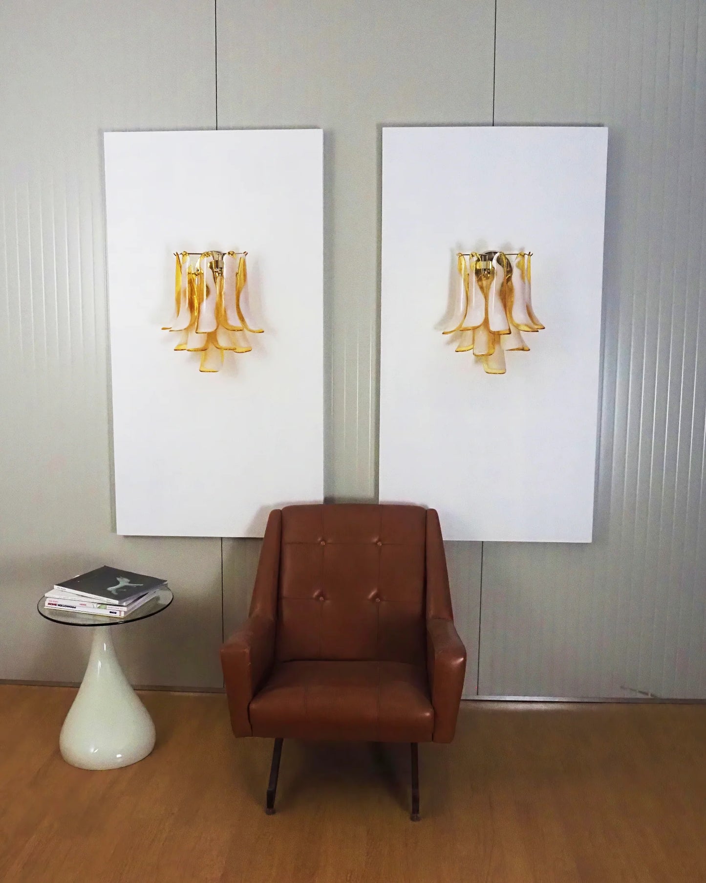 Vintage Murano Caramel Wall Lights, Enhance your space. Crafted with Caramel and white glass petals in a metal frame, these lights instantly add a touch of elegance. Experience the beautiful light and effects they cast when opened or closed.