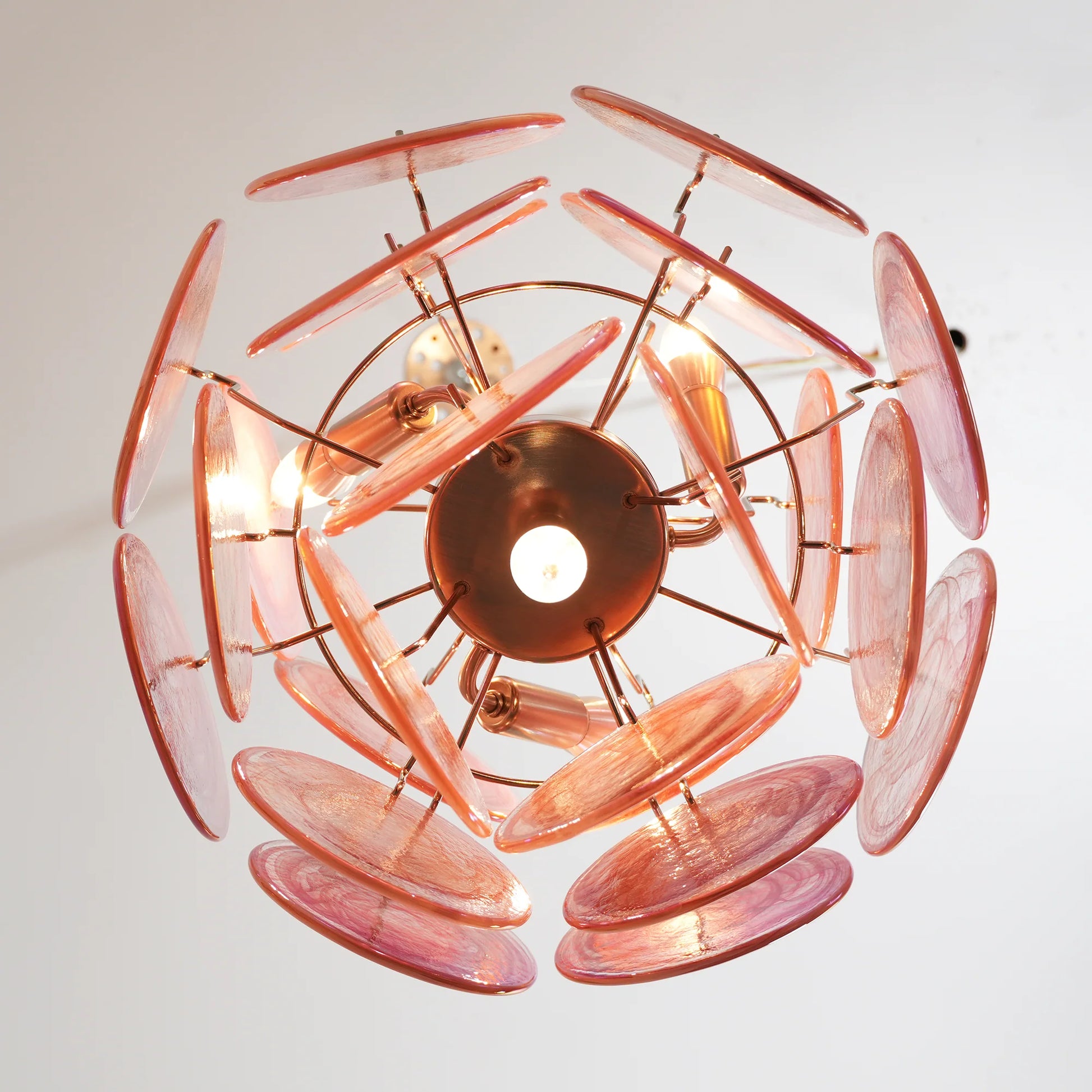 Vintage Murano Pink Glass Disks Chandelier. Add a touch of vintage elegance to your home with the stunning Murano Pink Disks Chandelier. Creating a captivating and sophisticated centerpiece that enhances any room's decor. The Pink Disks Chandelier provides a striking visual impact with its unique design and vibrant color. Provides a warm and inviting glow that adds a touch of elegance and charm to any space.