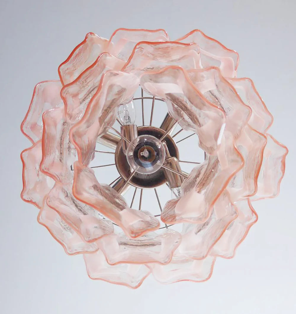 Experience the breathtaking elegance of the Vintage Murano Pink Glasses Chandelier. Handcrafted with glass sheets and a sturdy metal frame, this chandelier boasts a striking blend of transparent and Pink hues, making it a truly one-of-a-kind piece.