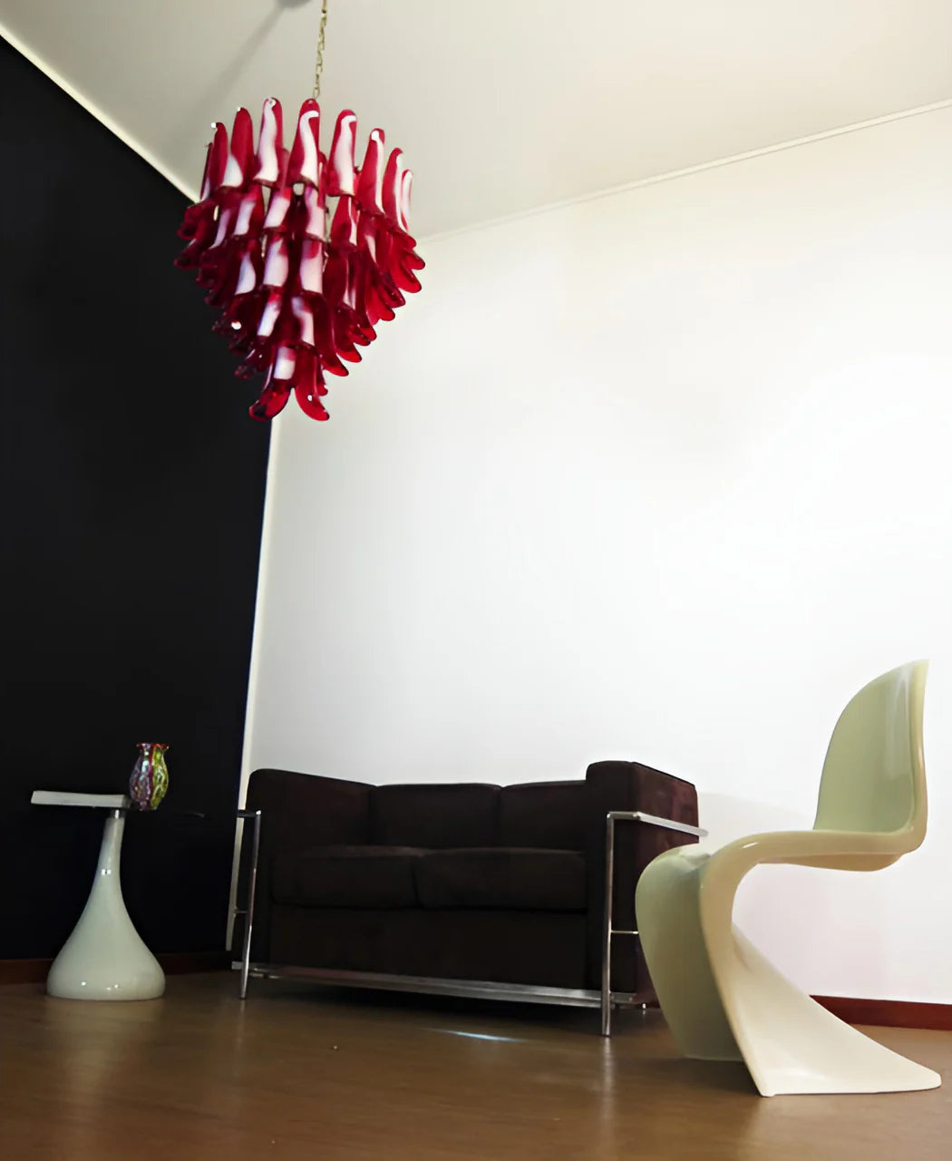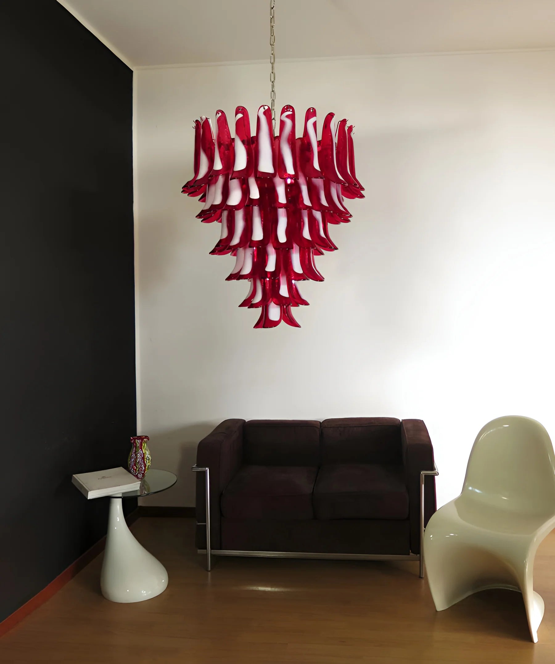 Vintage Murano Red Glass Petals Chandelier, Add a touch of vintage elegance to your home. Featuring beautifully crafted red glass petals, this stunning chandelier creates a captivating and sophisticated centerpiece that enhances any room's decor. Provides a striking visual impact with its unique design and vibrant color. Add a touch of elegance and charm to any space.